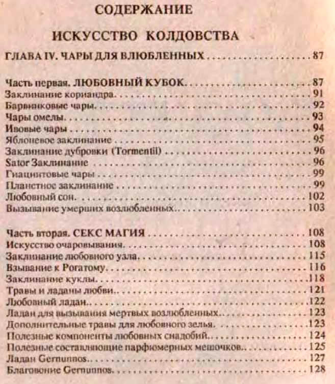 «Практическое руководство для ведьм, колдунов и шабашей ведьм» («Искусство колдовства») ГЛАВА IV. Чары для влюбленных издана в Англии в 1970 г. В ней в доступной форме подробно раскрываются практически все секреты колдовства, накопленные многими поколениями колдунов.